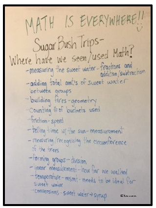 Comme dans la première année, nous avons continué d’explorer les mathématiques qui ont été infusées dans le savoir autochtone partagé en ce qui concerne la relation entre la terre, la récolte de l’eau douce et sa transformation en sirop d’érable.
