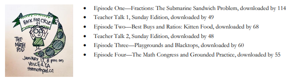 - Math Pod en ligne :Math Pod 1: Le site Web a eu 3 689 vues, 1 294 visiteurs et les podcasts ont eu 521 téléchargements;Math Pod 2 : 499 gazouillis (tweets avec mention #MathPod) ont obtenu environ 47 000 impressions (Tweets qui ont généré quelques interactions);