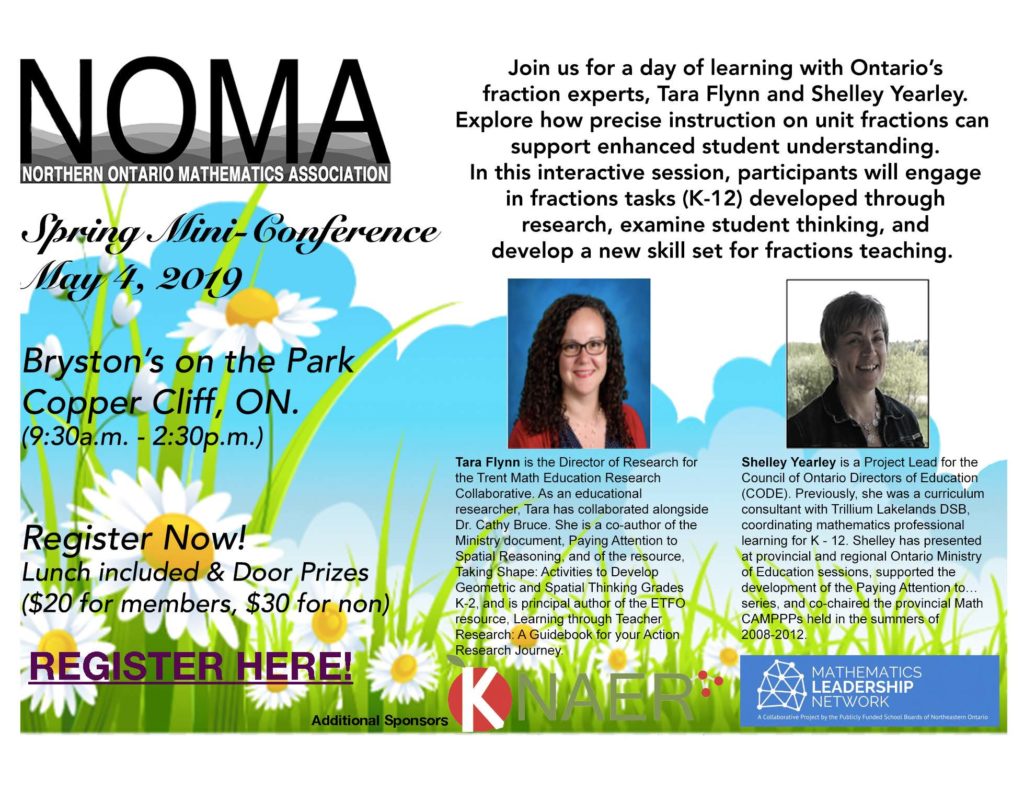 La troisième journée (samedi 4 mai) a été animée par NOMA (Northern Ontario Mathematics Association) et mettait en vedette Shelley Yearley et Tara Flynn. Huit années de recherche dans les salles de classe de l’Ontario, de la maternelle à la 12e année, ont mené à l’élaboration du Fractions Learning Pathways, un cadre de planification pour l’enseignement des fractions. Au cours de cette séance interactive, les participants se sont engagés dans des tâches de fractions développées grâce à la recherche, ont examiné la pensée des élèves et ont développé un nouvel ensemble de compétences pour l’enseignement des fractions. En mettant l’accent sur l’établissement de bases solides pour les jeunes élèves et la réduction stratégique des écarts pour les élèves plus âgés, cet apprentissage a mis en évidence le rôle important que joue la compréhension des fractions unitaires dans les concepts ultérieurs, tels que l’équivalence, l’inégalité et les opérations. L’utilisation de représentations puissantes, d’un langage précis et d’une planification ciblée a permis aux éducateurs de mettre immédiatement en œuvre le matériel dans leur pratique.